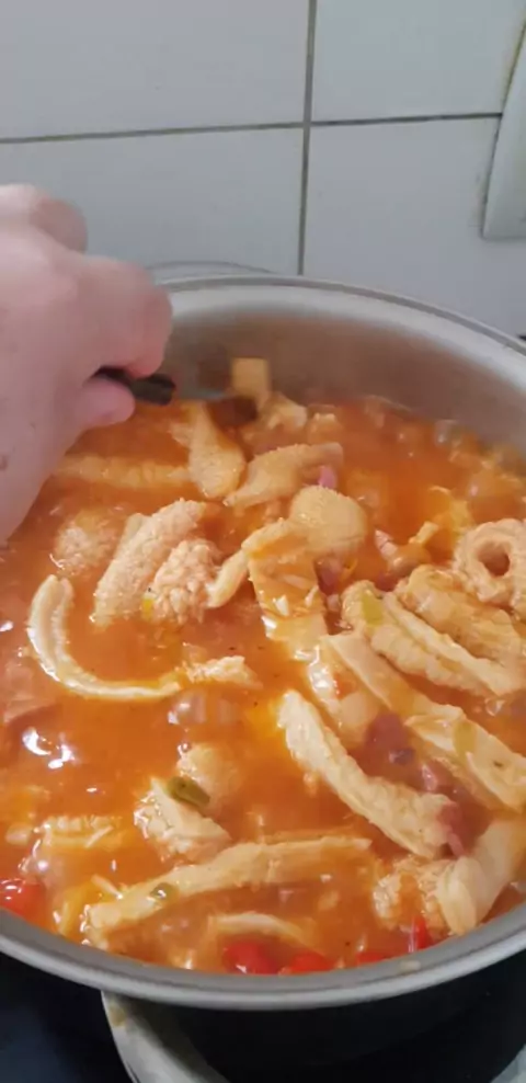 Dobradinha tradicional caipira, receita que aprendi com minha avó. (bucho limpo e cozido, bacon, linguiça calabresa, cebola, alho, cheiro verde, exetrato de tomate, folhas de louro, sal e pimenta a gosto) #dobradinha #buchada #comidacaipira