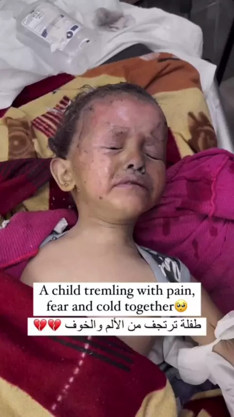 Seorang anak yang gemetar karena kesakitan, ketakutan, dan kedinginan secara bersamaan #Israel🇮🇱 KEJI #keepgazaconnected