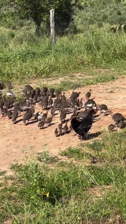 A galinha adotou uma ninhada de Guiné #agro #galinha #roça