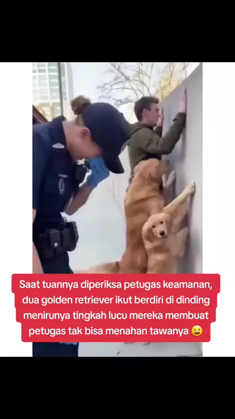 Saat tuannya diperiksa petugas keamanan, dua golden retriever ikut berdiri di dinding menirunya tingkah lucu mereka membuat petugas tak bisa menahan tawanya 😆 #lucu #gemas #goldenretriever #lovedogs🐶🐕 #