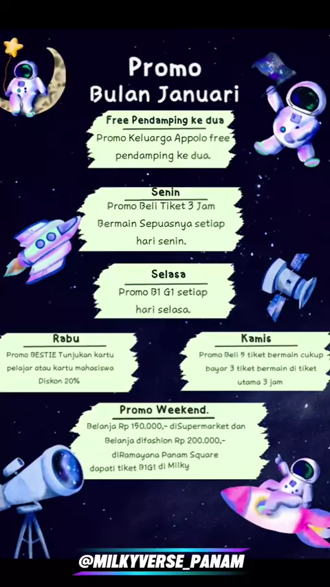 ✨Januari Full senyum😎 Nah buat sahabat semua🙌 📝Yang belum dapati promo promo, ayoo.. Cobain semua promo gokil dan main kan semua wahana seru inii yahh🚀#milkyversepanam#playgroundpku#rombonganseru#promojanuari