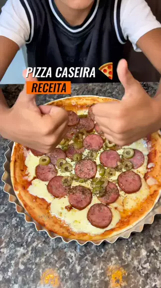 Pizza Caseira. Compramos a massa pronta no supermercado, além dos ingredientes: molho de tomate, queijo mussarela, calabresa, azeitona e orégano. #pizza #KwaiChef #receitafacil