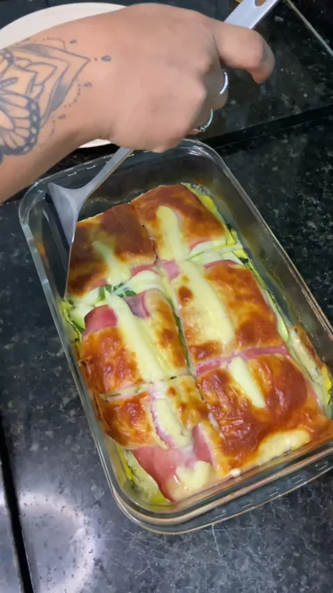 ABOBRINHA RECHEADA Receita 👩🏻🍳🍲 2 - Abobrinha verde 300g de Presunto 300g de Muçarela Requeijão cremoso (Sal a gosto, eu não usei na receita) #Receita #receitasimples #fit #viral
