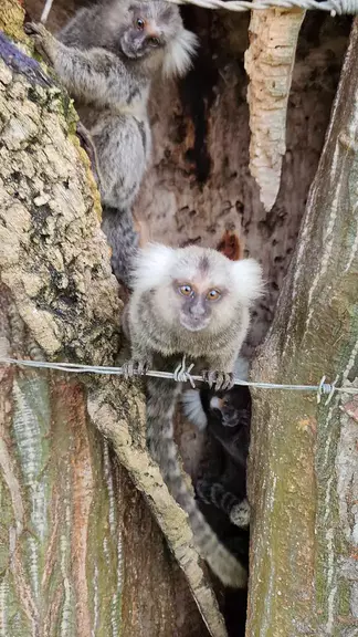 Os dois filhotes de sagui brincando no buraco.