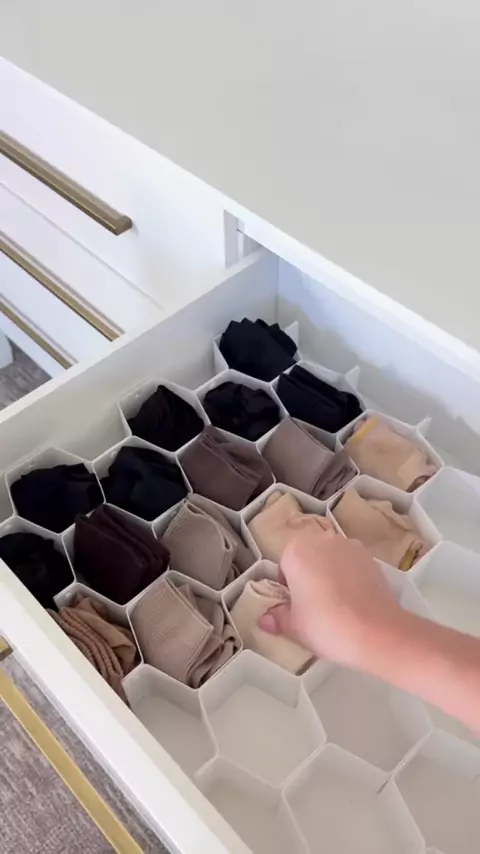 Organização prática e sem bagunça 💡 🔍 organizador de gaveta | separador de roupas | colmeia organizadora | dica de organização 📌 Salva essa dica e manda pra aquela amiga que perde as meias toda semana!"