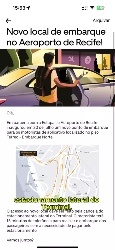 Novo local de embarque no Aeroporto de Recife! Olá, Em parceria com a Estapar, o Aeroporto de Recife inaugurou em 30 de julho um novo ponto de embarque para os motoristas de aplicativo localizado no piso Térreo - Embarque Norte. O acesso ao novo local deve ser feito pela cancela do estacionamento lateral do Terminal. O motorista terá 15 minutos de tolerância para realizar o embarque dos passageiros, sem a necessidade de pagar pelo estacionamento. Vamos juntos?