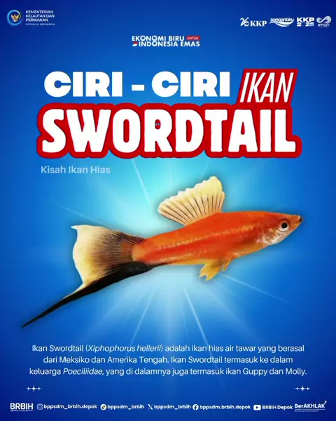 Hi Sobat Ikan Hias! Ikan Swordtail (_Xiphophorus hellerii_) dinamakan dari bentuk ekornya yang panjang menyerupai pedang. Selain mudah dipelihara, ikan ini juga sering digunakan dalam penelitian genetika karena mudah dikembangbiakkan! @kkpgoid @bppsdm_KP #PanganBiru #2025KKPRiseTogether #EkonomiBiruUntukIndonesiaEmas #KKPGOID #BRBIH