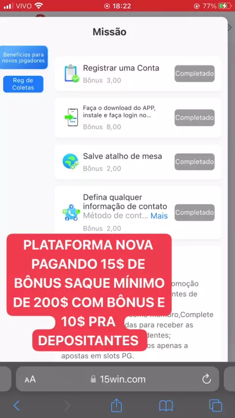 BÔNUS DE R$15😍 saque mínimo de R$200 com bonus e😱🤞🍀 Saque de R$10 p depositantes😎💵💵🤑https://15win.com/?id=53622962 🍀🍀🍀 Cuida tropa, pode acabar a qualquer momento🤞🤞🤞🤞💵💵💵🤑🤑🍀🍀🍀 #bonusnocadastro #novaplataforma #plataformabugada #plataformapagando #bonus