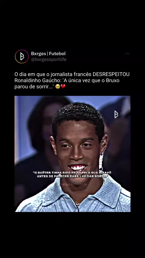Nesse dia, o repórter olhou para o Ronaldinho e lhe perguntou: ‘Você é bi?’, até então, o Ronaldinho levou na brincadeira e lhe respondeu: ‘Não!’, com o seu carisma de sempre. Até que o repórter disse: ‘Então tire o seu suéter!’, isso entristeceu o Ronaldinho, já que aquele suéter, que ele utilizava, tinha sido feito por sua bisavó antes dela falecer, para lhe dar sorte. 🥷🏾 siga @bxrgessportlife 🔔 ative as notificações 🏆 salve, curte e compartilha 🙅🏾♂️ marque seu amigo #futebol #foo...