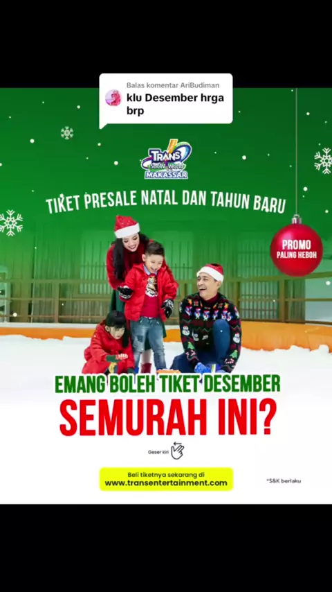 Membalas @AriBudiman emang boleh tiket Desember SEMURAH INI? ๐๐ Jangan sampai ketinggalan promonya, karena promo ini hanya bisa dibeli sampai tanggal 9 November aja!#promonovember#promoakhirtahun#referensiliburan#transsnowworldmakassar
