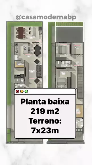 Planta baixa Humanizada em terreno de 7x23 metros . Sobrado / Duplex com ótimo custo benefício, economia na construção . São 4 quartos, suíte master com closet enorme, varanda gourmet, cozinha integrada com sala de jantar, churrasqueira, ilha e varanda no pavimento superior #fachadamoderna #contruindominhacasa #casamoderna #minhacasaminhavida #projeto