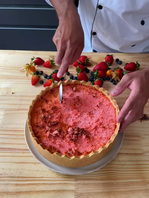 Torta flora de morango Ingredientes 5 ovos 550g de leite condensado 700ml de leite 2 colheres de amido 1 tang de morango Bater tudo junto por 1 minuto Assar na temperatura que você já assa outros bolos, o temo varia muito de forno pra forno, forno de lastro 180 graus por aproximadamente 60 a 70 minutos, forno turbo 150 graus por aproximadamente 40 a 50 minutos o mais importante é a torta sair firme do forno e depois levar ao freezer até esfriar bem, aproximadamente 2 horas Ingredientes da