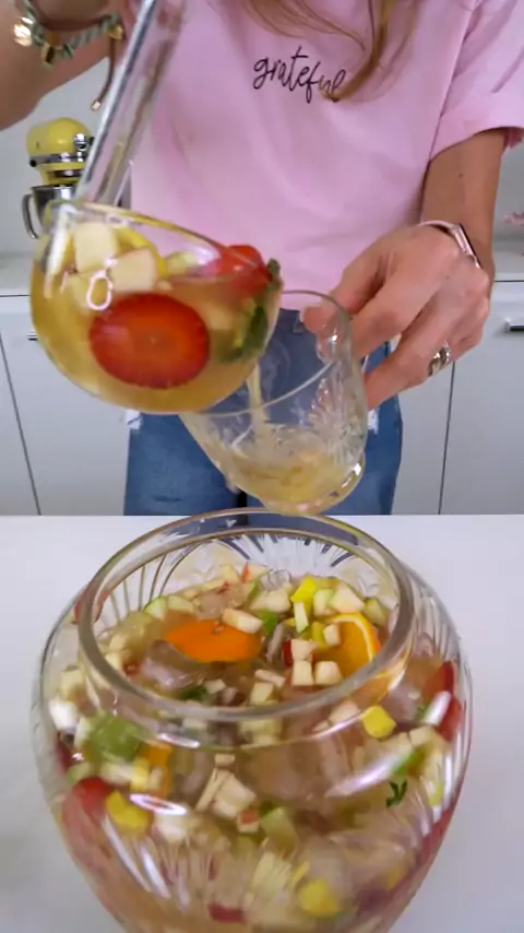 Revelei a FAMOSA receita de Natal da minha mãe! #natal #fblifestyle INGREDIENTES: - 1/2 abacaxi - 2 pêssegos - 1/2 maçã fuji - 1/2 maçã verde - 1 cx. de morango - 1 cacho de uva verde - 1 manga - 1 laranja bahia - polpa de 1 maracujá - 1/2 limão - folhas de hortelã (a gosto) - 1 copo de suco de laranja - 1 litro de guaraná (refrigerante) - 1 garrafa de vinho rosé seco - 1 dose (100 ml) de gin - gelo MODO DE FAZER: Corte as frutas e mexa todos os ingredientes. Finalize com gelo e sirva! Dica: