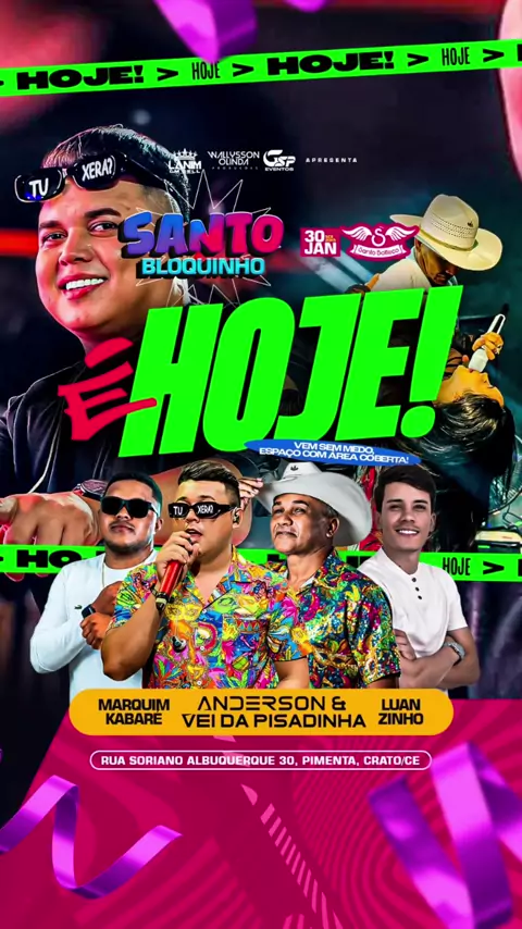 💃🎊 Alô Crato. Alô Cariri. 🏖️ Já é Hoje o Santo Bloquinho no @santobotteco. E pra agitar a nossa noite em ritmo de Carnaval tem @andersoncantoroficial_ @veidapisadinhaoficial @marquim_kabare_ofc e @luanzinhovitor. Adquira os últimos ingressos no valor de 30,00 R$ e vem curtir o melhor Bloquinho do Cariri. 🎟️ Leve seus óculos escuros que vamos amanhecer o dia📍🔊🍻🎭🎺✨🚀 * * #hoje #santobloquinho #santoboteco #crato #cariri