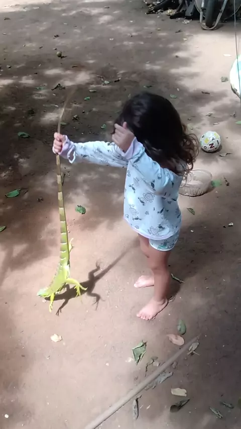 criança brincando com iguana