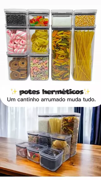 Até que chegaram eles: os potes herméticos em acrílico cristal. Transparente, empilhável, com trava firme. Cada coisa no seu lugar. Cada mantimento preservado.