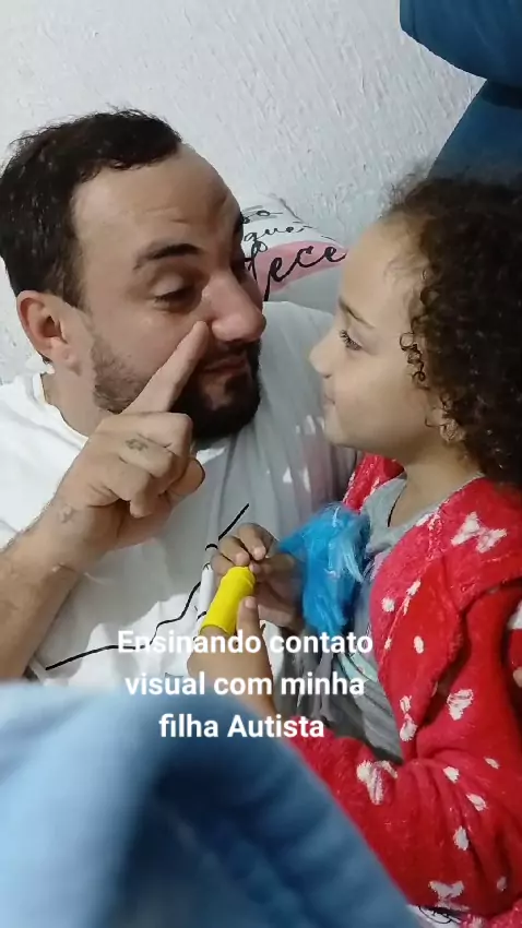 Ensinando minha filha autista a ter contato visual , isso é muito importante na faze do aprendizado .