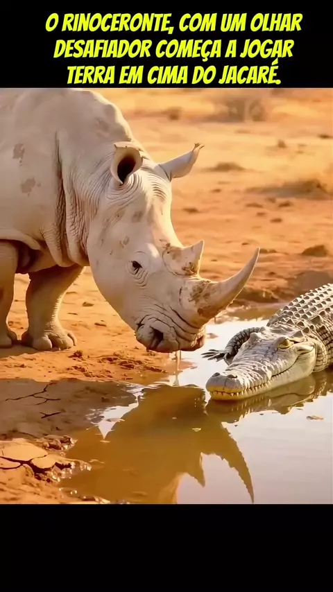 PROVOCAÇÃO! O rinoceronte, com um olhar desafiador começa a jogar terra em cima do jacaré.
