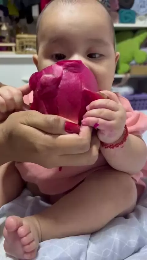 Maria comendo pitaya apenas com 4 meses. sei que a introdução alimentar é apenas a partir de 6 meses. mas com a Maria é diferente. e graças a Deus, não aconteceu nada. #pitaya😋