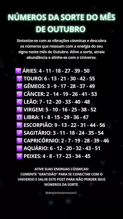 đ„ NĂMEROS DA SORTE DE OUTUBRO PARA CADA SIGNO đ„ Outubro chega irradiando energia cĂłsmica poderosa âš O mĂȘs universal 10 abre caminhos de renovação, prosperidade e expansĂŁo espiritual. Cada nĂșmero traz uma frequĂȘncia Ășnica para alinhar vocĂȘ ao fluxo divino do Universo. đ« Descubra quais sĂŁo os nĂșmeros da sorte que vibram com o seu signo neste mĂȘs! đ COMENTE: GRATIDĂO + [SEU SIGNO] + ATIVAR e manifeste abundĂąncia atravĂ©s da lei da atração. đ SALVE para consultar durante outubro ⥠SIGA @...