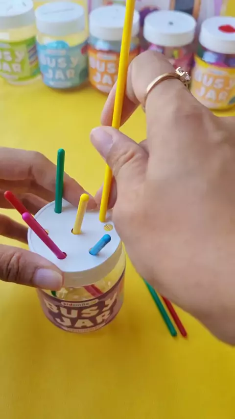 Bisa nggak ya masukkan stik tanpa lihat? π Main sensorik seru pakai Busy Jar! Melatih fokus, kepekaan peraba, dan koordinasi tangan anak!! #busyjar #montessoritoys #motorikhalus #sensoryactivities #mainanedukasianak