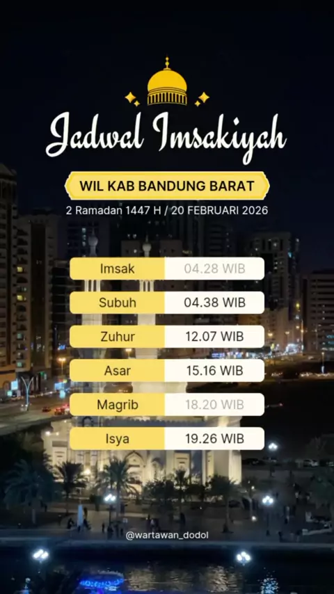 Jadwal Imsak Bandung Raya 20 Februari 2026 | Ramadan 1447 H Hari ke-2 Jadwal imsak dan sholat hari ke-2 Ramadan 1447 H (20 Februari 2026) untuk wilayah Bandung, Cimahi, Kabupaten Bandung, dan Kabupaten Bandung Barat. Cek waktu sahur & berbuka biar nggak kelewat! #Ramadan1447H #BandungRaya #JadwalImsak #PuasaHariIni #SnackVideoIndonesia