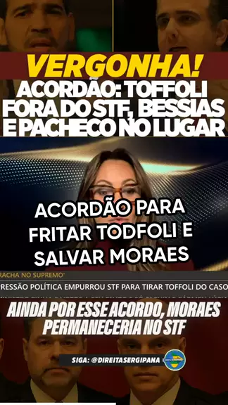 O sistema não dorme, mas nós também não! Está sendo discutido um grande acordão entre o governo Lula e membros do Centrão para fritar Dias Toffoli e salvar Alexandre de Moraes. Enquanto TOFFOLI sofreria impeachment, Moraes continuaria com seu reinado no STF. Além disso, com a saída de Toffoli da suprema corte, Lula teria que indicar Rodrigo Pacheco no lugar dele. Em troca, Alcolumbre faria a sabatina de Jorge Messias e ambos seriam aprovados para a corte. #ForaLula #sistema #acordo