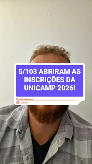 Quando abrem as inscrições para a UNICAMP 2026? Dia 01/08 até dia 01/09 ficarão abertas as inscrições do vestibular da UNICAMP 2026, através do vestibular COMVEST. A inscrição é feita através do SITE; www.comvest.unicamp.br NÃO ESQUEÇA DA TAXA DE INSCRIÇÃO - R$221,00 Todos os dias teremos vídeos de dicas daqui até o ENEM #5/103 #vestibular #unicamp #inscrições #dicas