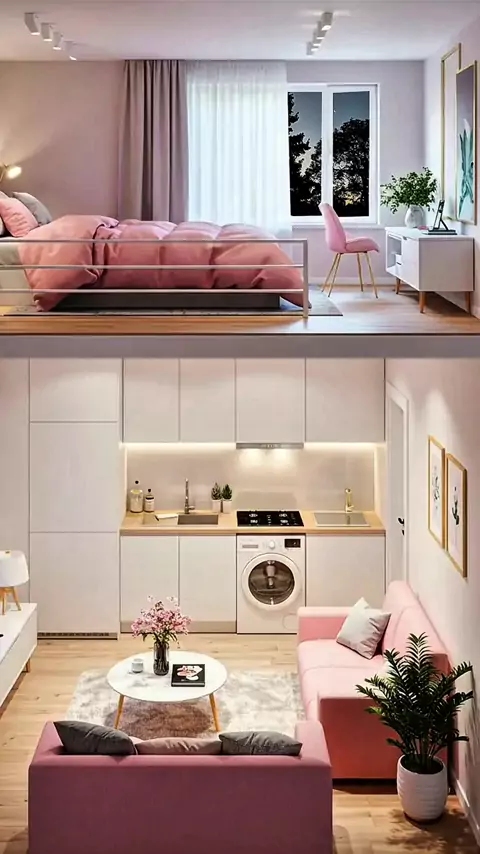 Step into this chic and cozy pink loft apartment! 🎀 Discover smart space-saving solutions with a beautiful loft bed, modern kitchenette with a washing machine, and a comfy living area. Perfect inspiration for your dream tiny home or studio apartment. ✨