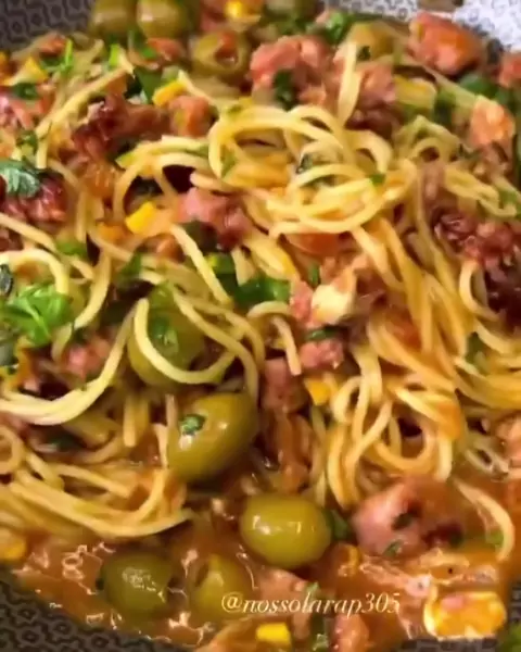 Macarrão suculento🍝 #linguiça #molhodetomate #cheiroverde #azeitonas #macarraosuculento