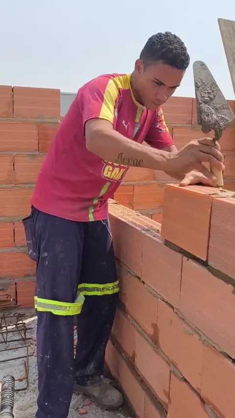 ensinando o ajudante a assentar tijolos na obra.