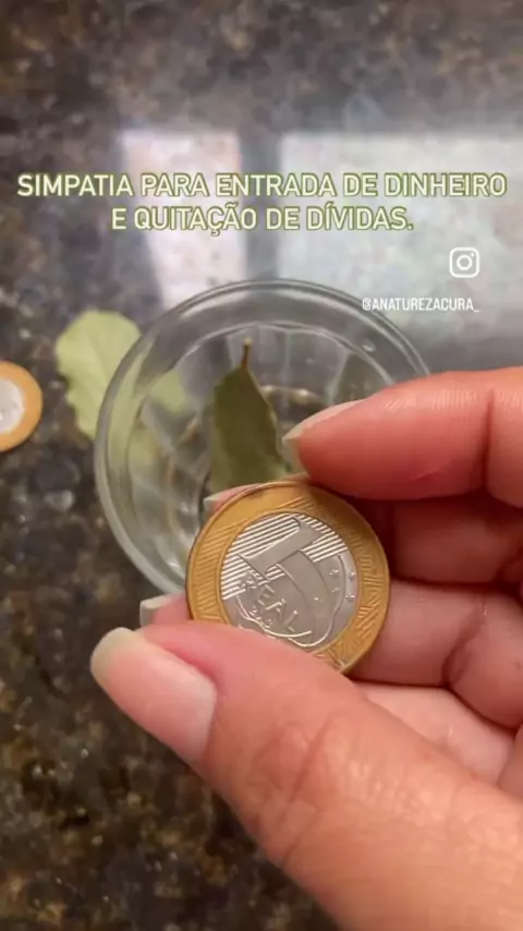 1 copo com água filtrada 3 folhas de louro 3 moedas do mesmo valor (lavem a moeda com sal em água corrente antes) Vai pegar a folha de louro mentalizando o seu pedido, por exemplo, entrada de dinheiro extra, quitação de dívidas e etc, depois disso, irá colocar a folha de louro na água e repetir o mesmo processo com a moeda. São três pedidos! Após isso, deixar em um local alto e seguro da sua casa por sete dias, passado esses sete dias, pode lavar e usar o copo normalmente, utilizar as moedas p