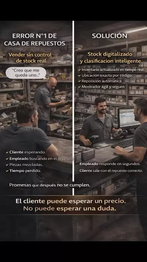 La venta no se cae por el precio. Se cae cuando dudás. El cliente llega sabiendo lo que necesita. Código, modelo, año. Si en el mostrador aparece el “dejame ver si lo encuentro”… la confianza empieza a bajar. No es solo una pieza. Es la seguridad de que estás hablando con alguien que tiene el control. Cada minuto buscando en el depósito es una señal silenciosa de desorden. Y el desorden en este rubro no se discute: se reemplaza. Un negocio sólido no es el que más repuestos acumula #viral