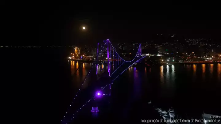 Após uma década de expectativa, a emblemática Ponte Hercílio Luz, símbolo maior de Santa Catarina, brilhou novamente com uma deslumbrante iluminação cênica. O momento histórico foi celebrada em grande estilo em Florianópolis! O ponto alto da noite foi a contagem regressiva exibida na Megatela, unindo ilha e o continente, para o início do espetáculo de luzes! #MOON #turismo #floripa #FloripaSquare #verão