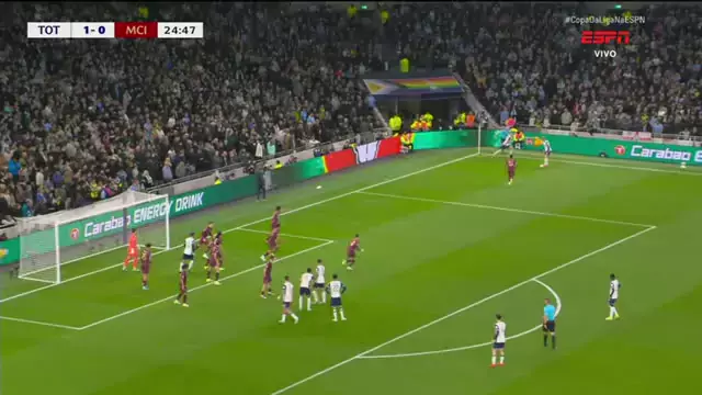 Golaço do Tottenham! Em jogada ensaiada de escanteio, Sarr finaliza de fora da área com muito efeito e marca Tottenham e Manchester City se enfrentam pelas oitavas de final da Copa da Liga Inglesa #Tottenham #manCity #football #CarabaoCup #PremierLeague