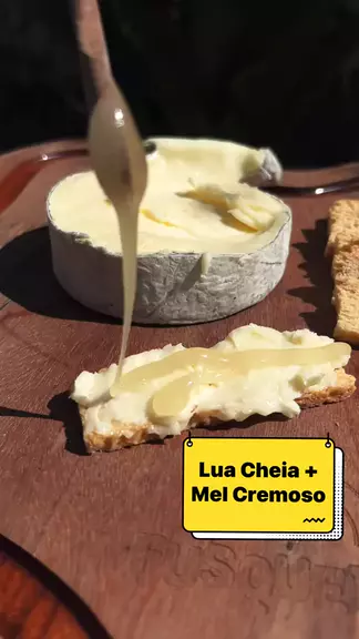 ✨ Queijo Lua Cheia + Mel Cremoso ✨ Uma experiência gastronômica de outro nível para os verdadeiros amantes de queijos! 🌙 Queijo Lua Cheia: Premiado internacionalmente e elaborado com leite de vaca pasteurizado e dupla adição de creme, maturado por 3 meses para alcançar uma cremosidade incomparável. Envolto em uma camada de carvão vegetal e casca florida, seu sabor evolui de notas amanteigadas e levemente ácidas para um toque que lembra cogumelos e nozes.
