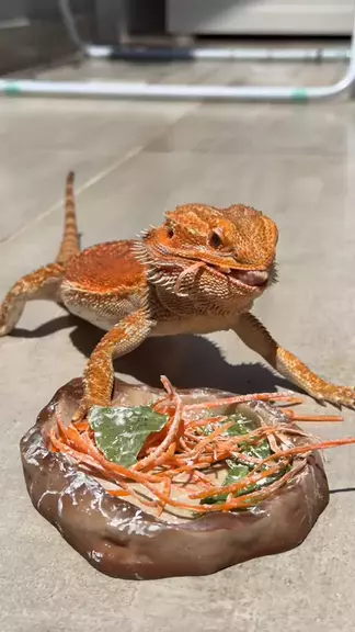 Tunico ( #pogonavitticeps ) amassando uma cenoura com rúcula #pogona #lagarto #exoticon