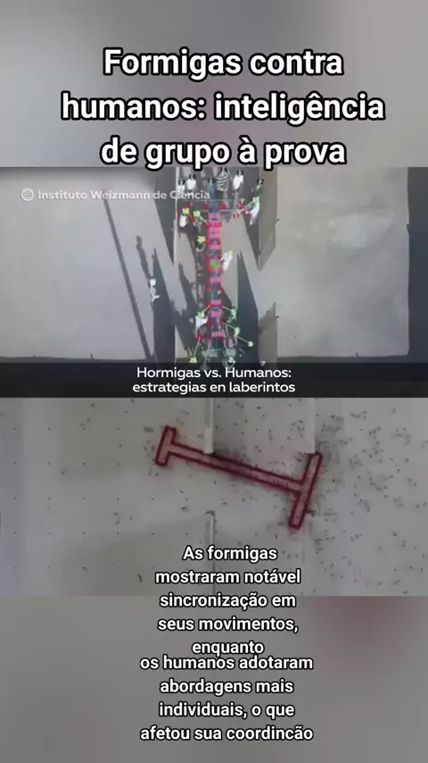 Formigas contra humanos: inteligência de grupo à prova Numa experiência para comparar a resolução de problemas entre formigas e humanos, ambos os grupos foram observados manobrando um objeto em forma de T através de um labirinto. Os humanos eram impedidos de se comunicar pela fala, de modo que se encontravam em condições semelhantes às dos insetos. As formigas mostraram notável sincronização em seus movimentos, enquanto os humanos adotaram abordagens mais individuais, o que afetou sua coord