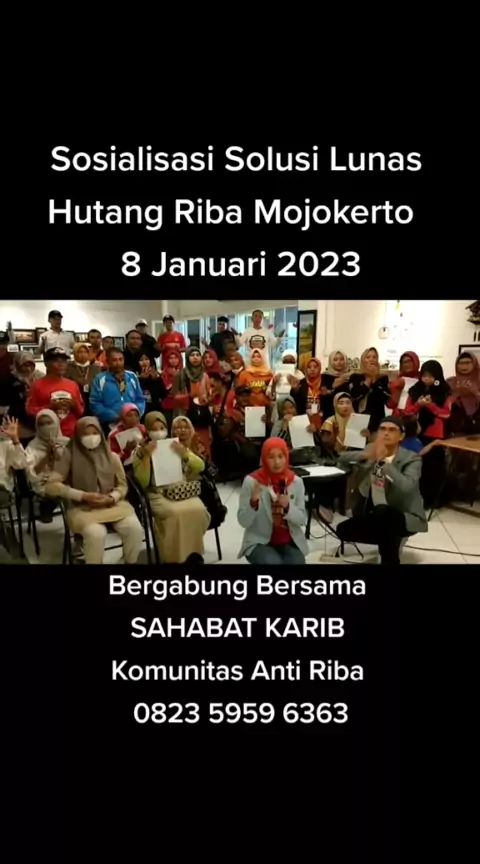 Sosialisasi Solusi Lunas Hutang Riba Mojokerto 8 Januari 2023 Bergabung Bersama SAHABAT KARIB (Komunitas Anti Riba) 0823 5959 6363#ptbest#goberkahnoriba#sahabatkarib#solusilunashutangdanriba#bisnissyariah#peluangusaha#peluangbisnis#peluangbisnisonline#seminar#solusilunashutang#gobaitullah#bisnismillenial#bisnisonlinepemula#bisnisonlinehalal#peluangreseller#peluangsukses#motorcash#mobilcash#pajerocash#rumahcash#lunashutangriba#bisnisonline#sinergymocash#mocash#mojokerto#mojokerto#mojokerto...