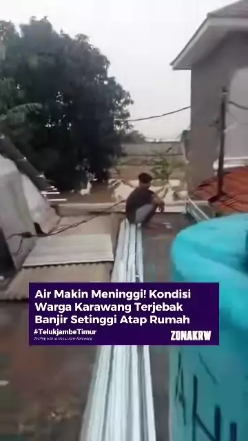 Warga terjebak banjir setinggi atap rumah karena air semakin meninggi di Kp. Tegal Luhur, Desa Sukamakmur, Telukjambe Timur, Karawang pada Senin (19/1). Video @rengganisph#zonakrw#karawang#laporanwargakrw#banjir