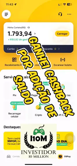 Fala galerinhaaaaaa A conta da 99pay está funcionando perfeitamente. Sem nenhum problema. Lógico que agora temos bem menos dinheiro o que me deixa tranquilo. E ganhamos cashback por adição de saldo. Nunca nem ouvi falar. E vc, já ganhou também? #99pay #cashback #investimentos