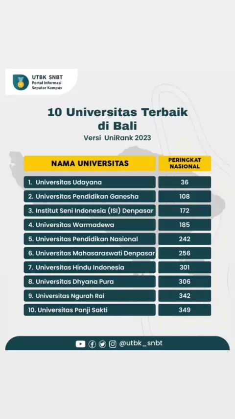 Berikut adalah daftar Universitas terbaik di Bali versi UniRank terbaru tahun 2023!! Sumber: www.4icu.org/id/ #unirank #rankinguniversitas #universitasterbaik #kampusterbaik #kampusbali #infokampus #infocamaba