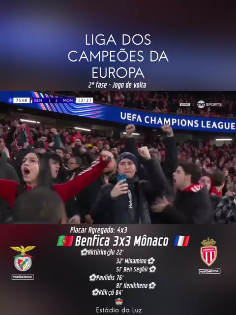 Benfica 3x3 Mônaco - Pelo jogo de volta dos Play-offs da Liga dos Campeões da Europa, empate em 3 a 3. O time português se classifica com o placar agregado de 4 a 3. #championsleague #Futebol #gol #monaco #benfica