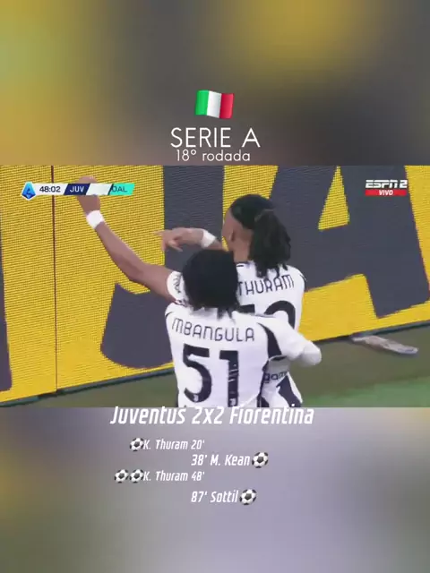 Juventus 2x2 Fiorentina - Pela 18° rodada do Campeonato Italiano, empate com 2 gols de Khéphren Thuram aos 20' e aos 48' para os mandantes, e Moise Kean aos 38' e Riccarso Sottil aos 87' para os visitantes. #seriea #juventus #gol #Futebol #fiorentina