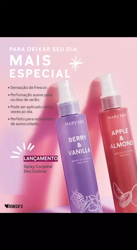 -*Spray Corporal Deo Colônia* - _Experimente a sensação de frescor e vivencie uma experiência completa de autocuidado!_ -*Hidratante Desodorante Corporal Perfumado Mary Kay®️* - _Mime a sua pele em apenas duas etapas_ *Passo 1 - Hidratação Profunda* *Passo 2 - Fragrância Deliciosa* -*Gel de Limpeza Corporal Perfumado Mary Kay®️* - _Desfrute de uma experiência de cuidados com a pele indulgente em apenas duas etapas_ *Espuma Perfumada* *Hidratação Profunda*
