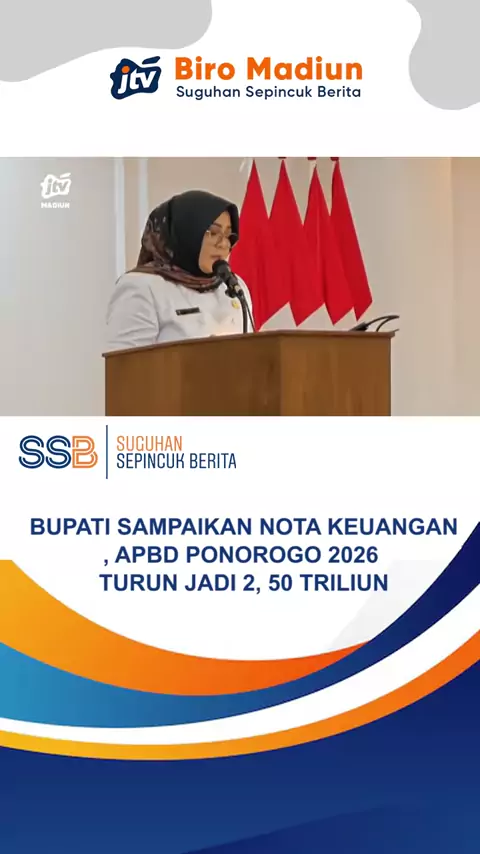 PONOROGO – APBD Ponorogo tahun 2026 dipastikan turun menjadi Rp2,50 triliun setelah adanya penyesuaian dari Kementerian Keuangan. Dalam Rapat Paripurna DPRD, PLT Bupati menyampaikan nota keuangan yang memuat prioritas belanja mulai dari kesehatan, pendidikan, infrastruktur, hingga urgensi relokasi TPA Mrican. Pembahasan kini berlanjut bersama TAPD sebelum masuk tahap persidangan berikutnya.#Ponorogo#APBD2026#RapatParipurna#DPRDPonorogo#PemkabPonorogo#AnggaranDaerah