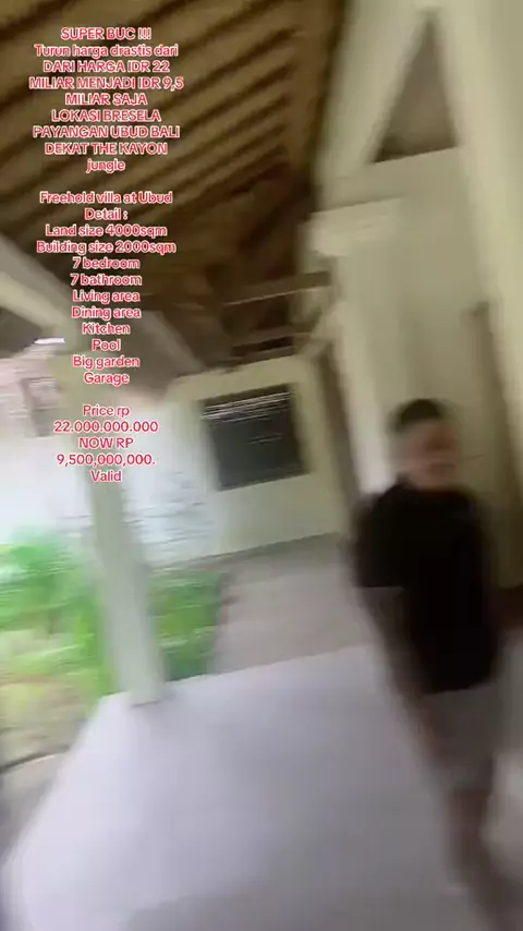 SUPER BUC !!! Turun harga drastis dari DARI HARGA IDR 22 MILIAR MENJADI IDR 9,5 MILIAR SAJA LOKASI BRESELA PAYANGAN UBUD BALI DEKAT THE KAYON jungle Freehold villa at Ubud Detail : Land size 4000sqm Building size 2000sqm 7 bedroom 7 bathroom Living area Dining area Kitchen Pool Big garden Garage Price rp 22.000.000.000 NOW RP 9,500,000,000. Valid