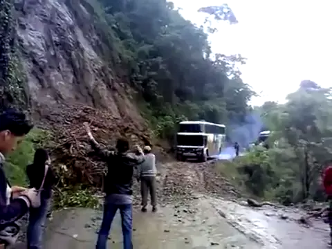 exato momento que ônibus cai em ribanceira na estrada da morte na Bolívia . More