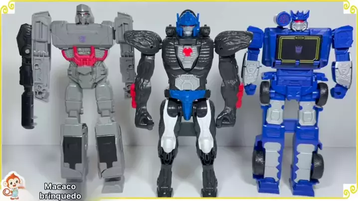 Novo unboxing de brinquedos Transformers: Optimus Prime e Megatron de uma pessoa máquina para um carro de jogo