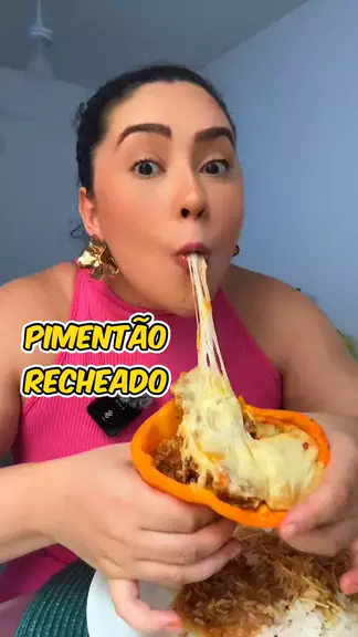 Comendo pimentão recheado com carne moída e queijo